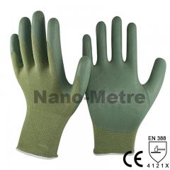 Description: 13 Gauge green bamboo fiber liner coated green foam nitrile on palm glove. Feature: 1.13 Gauge Seamless knitted green bamboo fiber liner. 2.Foam nitrile dipped on glove palm...
