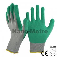 Description: NMSafety 13 gauge grey nylon liner coated green foam latex on palm glove. Feature: 1.13 Gauge Seamless knitted grey nylon liner, super soft for gardening. 2.Green foam latex...