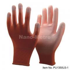 Description: NMSafety 13 gauge orange U3 polyester knitted liner coated white PU on palm glove. Feature: 1.13 Gauge Orange Seamless knitted U3 polyester liner. 2.White PU dipping on glov...