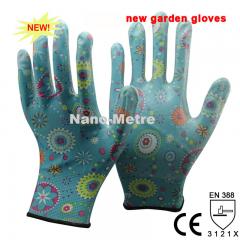 Description: NMSafety 13 gauge flower print polyester liner coated nitrile on palm glove. Feature: 1.13 Gauge Seamless knitted flower print polyester liner, super soft. 2.Nitrile dipped ...