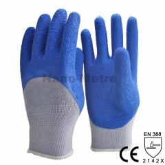 Description: NMSafety 10 gauge grey polycotton liner 3/4 coated blue latex crinkle finished on palm glove. Feature: 1.10 Gauge Seamless knitted grey polycotton liner. 2.Blue latex 3/4 di...