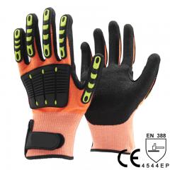 Description: NMSafety 13 gauge Orange Nylon+UHMWPE+Glassfibre liner coated sandy nitrile gloves, anti-vibration padding TPR on back, Magic Buckle. Feature: 1.13 Gauge Seamless knitted ora...