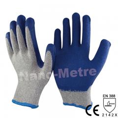 Description: NMSafety 10 gauge grey polycotton liner coated blue latex crinkle finished on palm glove,Economic style. Feature: 1.10 Gauge Seamless knitted grey polycotton liner. 2.Blue l...