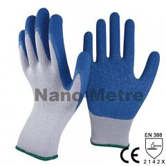 Description: NMSafety 10 gauge grey polycotton liner coated latex crinkle finished on palm glove. Feature: 1.10 Gauge Seamless knitted polycotton liner. 2.Blue latex dipped on glove palm...