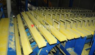 90 degree turning of the rock wool is used for changing the fiber direction and thus increase the adhesion strength of sandwich panel. The cross feed belt conveyor execute pulse feeding, and ...