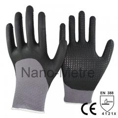 Description: 15 Gauge grey nylon and spandex liner 3/4 coated high-technology foam nitrile with dots on palm glove. Feature: 1.15 Gauge Seamless knitted grey nylon+spandex liner. 2.High-...