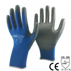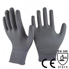 Description: NMSafety 13 gauge grey polyester knitted liner coated grey PU on palm glove. Feature: 1.13 Gauge Seamless knitted Polyester liner. 2.Grey PU dipping on glove palm,provide go...