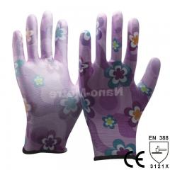 Description: NMSafety 13 gauge flower print polyester liner coated PU on palm glove. Feature: 1.13 Gauge flower print Seamless knitted polyester liner. 2.White PU dipping on glove palm a...