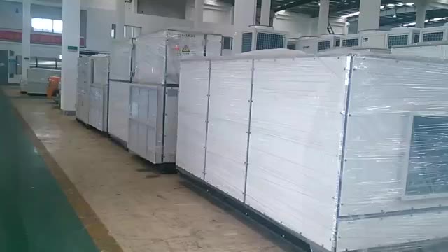 Products Features Capacity: 12~35kw. Efficiency: 2.7~3.3 cop. Warranty: Compressor- 3 years limited. other parts-1 year limited. Structure Panels and frame are made from galvanized steel protected with polyester powder painting to ensure total resistance toatmospheric agents. Direct expansion coils with condensate drain tray. Hermetic compressor High efficiency scroll compressor for the whole range, with built-in thermal overload cut-out and crankcase heater,mounted on rubber vibration dampers Ripple type acoustic insulation for compressor section, and thermal insulation for coil and fan section, low noise Centrifugal fan Forward curve centrifugal fans for air treatment section and axial fans for condensation section. Front, side and underside air discharge of the treatment unit. High external pressure, long air supply distance Electric panel Electric panel consists of breakers and contactors for compressors and fan motors, phase sequence relay and other necessary protection devices for the main components. Easy operation line controller Cooling/Heating/Auto. Error indication. Timing on/off. Product options Economizer with fresh, return air dampers and fresh air hood. Free cooling function for low ambient temperature. Low ambient control device for operation of outdoor units at ambient temperatures from less than 20°C down to -10°C BMS devices. T3 (Tropical climate). Condenser coil guard. Roof curb. Metal / aluminum filter. Air pressure switch for indoor fan. High static condenser fan option with sealed + drain.condensing section. Optional water heating coil. Metal or plastic mesh on condenser coil. Optional supply / return air configurations. Upgraded evaporator fan motor drives. G4 filter, plate and bag filter.